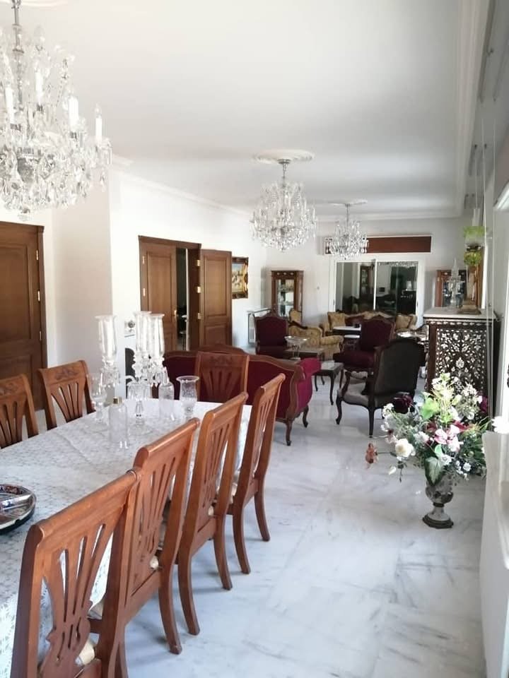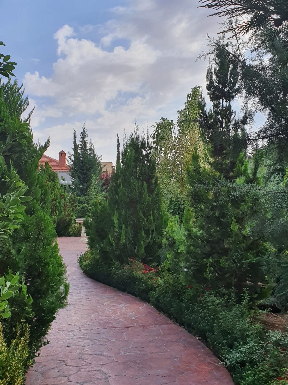 موقع عام كبير و جميل فيه حدائق متنوعة الاشجار و شجر سرو و صنوبر ثمري كبير معمر داير الارض و ممرات بازلتية عريضة حول مساحات مروج جازون و انارة خارجية كاملة و جلسة خارجية كبيرة ذات سقف قرميد مطلة على المسبح